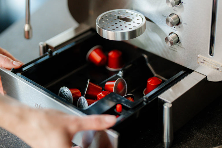 Outre les capsules classiques en aluminium, profitez d'un café sans tracas, sans déchets et sans culpabilité grâce à la compatibilité de notre machine avec les capsules compostables. Vous pouvez désormais savourer un café exquis et de qualité supérieure à partir d'une capsule 100 % biodégradable, en adoptant le développement durable à chaque gorgée.