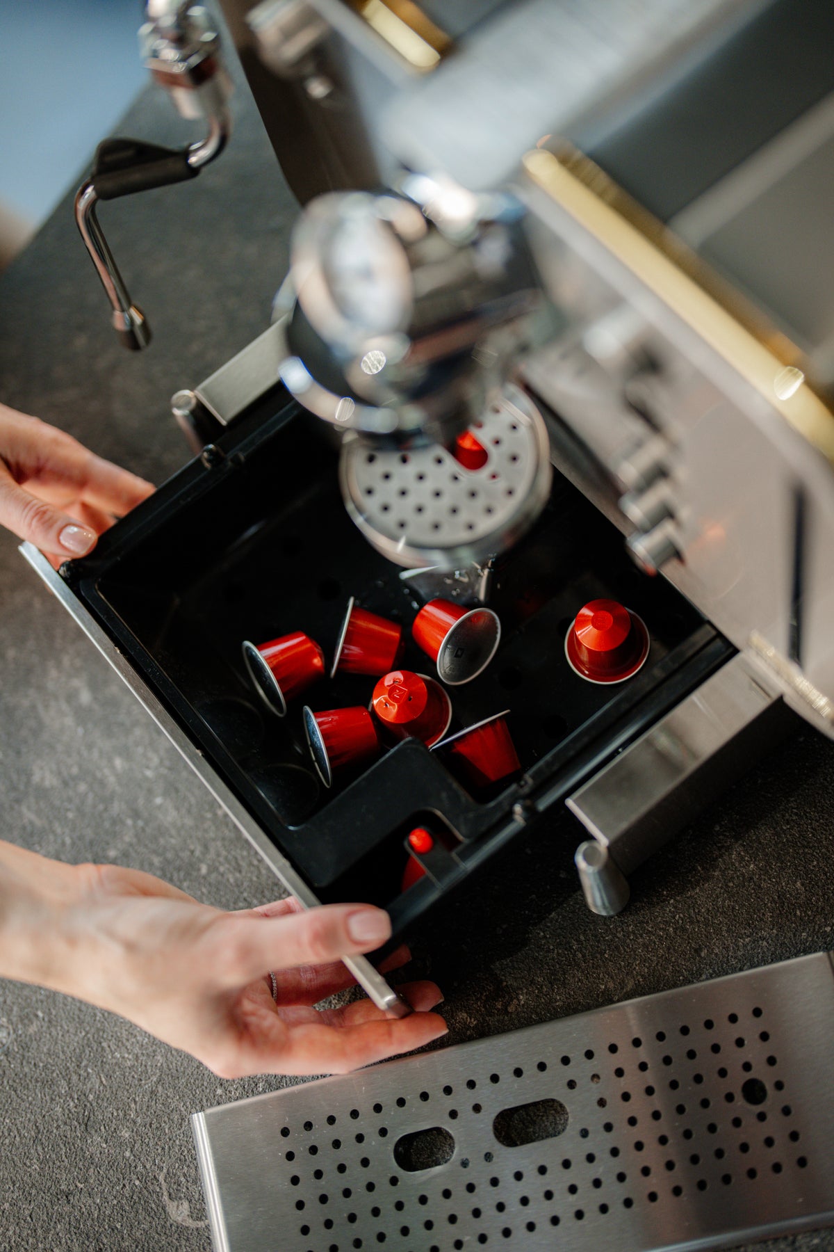 De ruime capsulecontainer kan meerdere gebruikte capsules bevatten, waardoor je ze minder vaak hoeft te legen en je aanrecht netjes blijft.